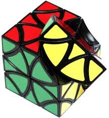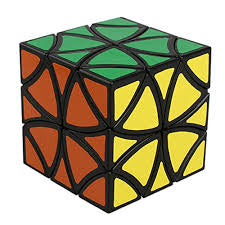 The Curvy Copter is a variation on the Helicopter Cube. The cuts are angled in order to reveal the otherwise hidden centerpieces, which also creates the beautifully curved face pattern. Revealing the centerpieces makes the puzzle a bit more difficult as they need to be oriented correctly for the puzzle to be solved.