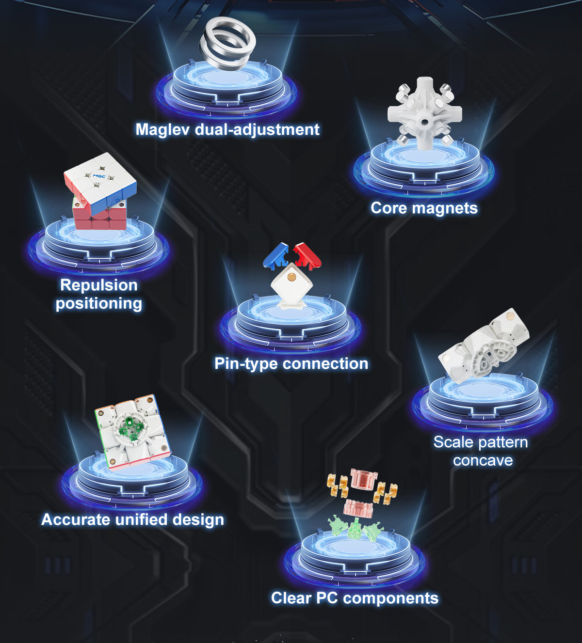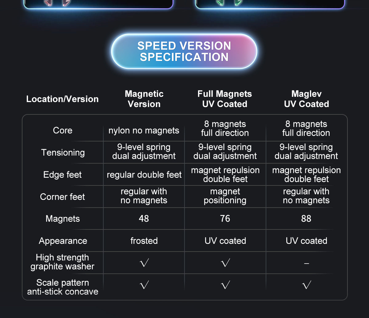 Magnetic Version: No core magnets, spring tensions, semi-matte finish. Full Magnets UV Coated: Core magnets, spring tensions, UV coating finish. Maglev UV Coated: Core magnets, maglev tensions, UV coating finish.