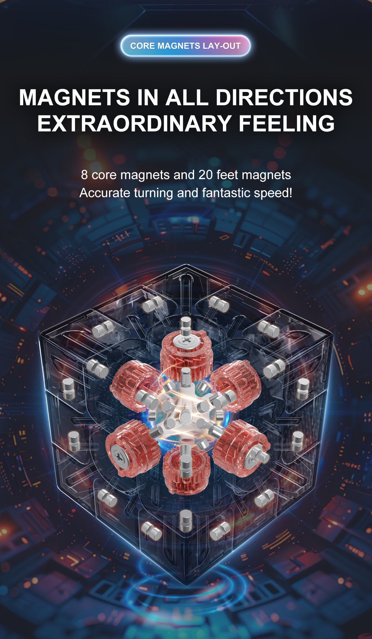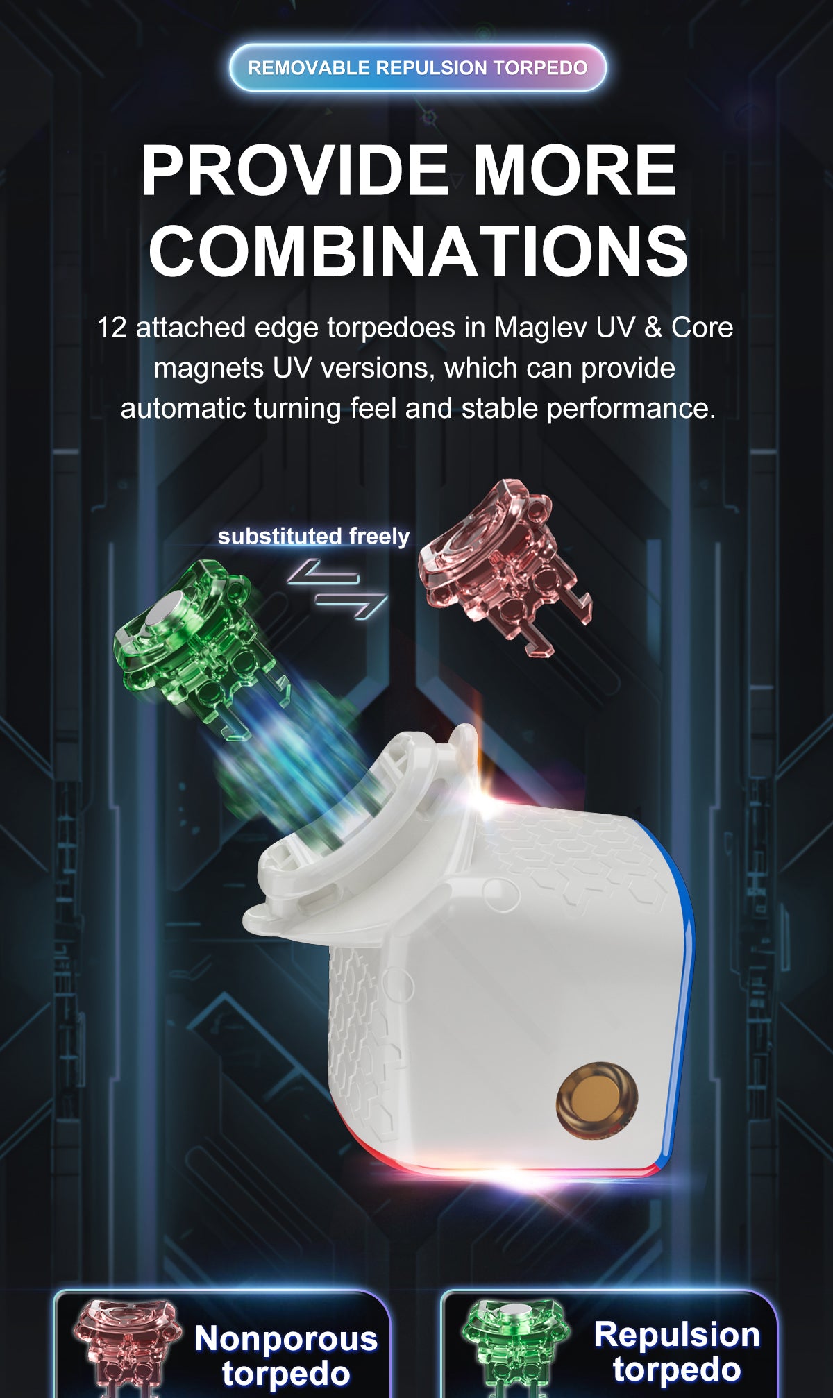 The core magnetic versions have an 8-magnet core, attracting magnets in the corner feet, and repelling magnets in the edge feet. The accessory box includes nonmagnetic edge torpedoes that you can replace the originals with, should you prefer that.