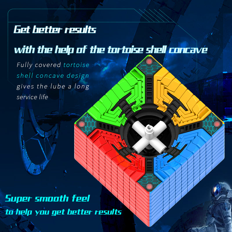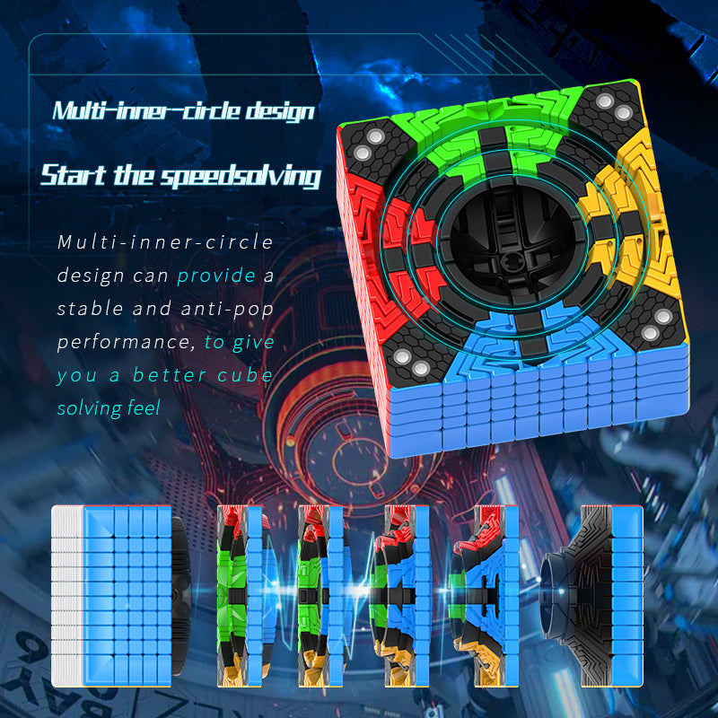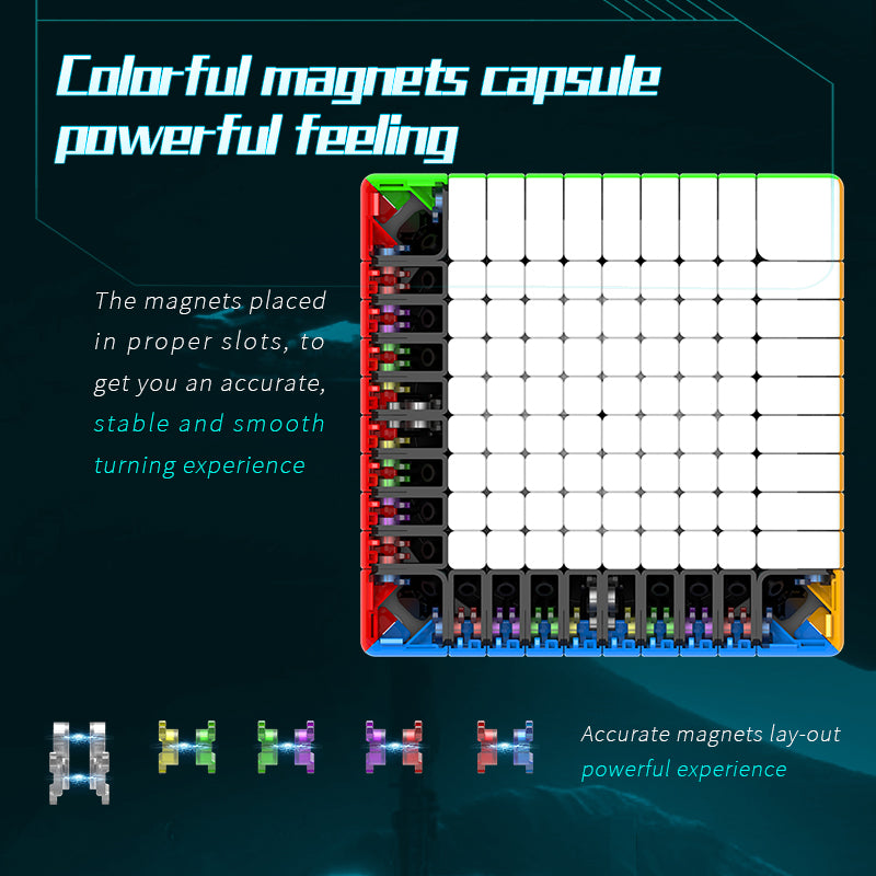 Diansheng is the first cube manufacturer producing nxn magnetic cubes larger than 7x7. The 10x10 is definitely ranked as the best 10x10 in the market currently. It has high tech magnetization and stable X-positioning. Its multi-inner circle design provides stable and anti-pop performance. The triple centre design makes the cube more stable and avoids lock-up issues. The core uses high quality nylon, precision screws and springs, which make the cube more stable.